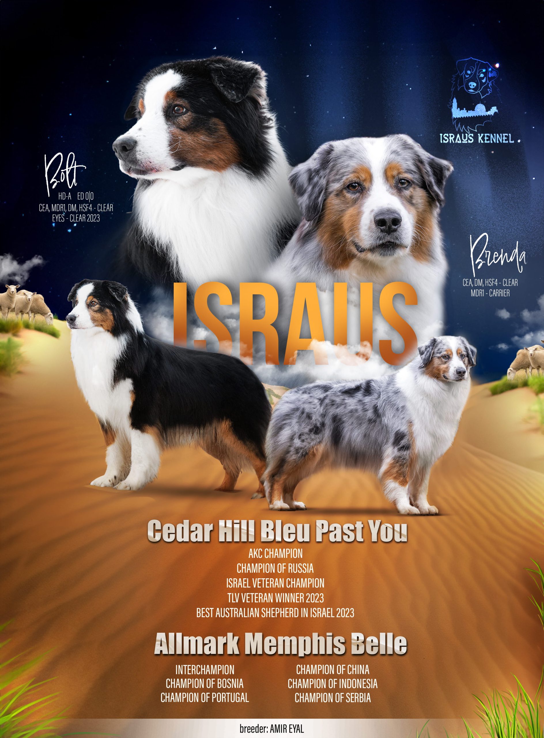 Brenda Australian Shapperd| x Years Old Date of Birth: ???Hips (AMVAC): ??Elbows (AMVAC): ??CEA: ??PRA: ??HSF4: ??ECVO: ??MDR1: Normal/Normal ??Height ?? cmOwner: S??